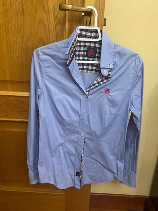 Camisa de manga larga de la marca Hispánico. - Color azul claro. - Detalle bordado rosa en el pecho. - Cuello con estampado de cuadros. - Cierre de botones.