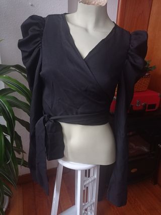camiseta color negro, de manga larga y cruzada delante con lazada