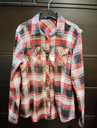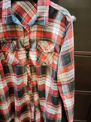 Camisa de manga larga. Cuadros tonos rojos, negros y blancos. Tejido gordito para invierno. Pocos usos