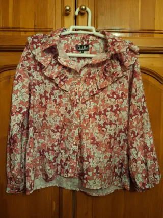 Camisa de estilo vintage con un diseño único. - Detalle de volantes y encaje. - Botones decorativos. - Mangas largas con lazada. - Estampado gráfico y texto.
