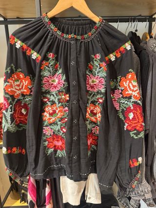Blusa con un diseño bordado muy detallado y colorido. - Cuello redondo con abalorios. - Mangas largas abullonadas. - Bordados florales en el frente y las mangas.