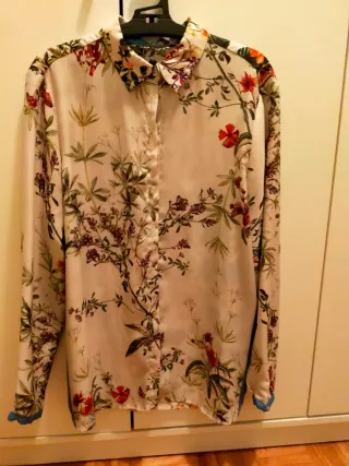 Blusa con un bonito estampado floral que le da un toque único. - Diseño con flores y ramas. - Cuello camisero. - Manga larga con botón en el puño - Tela con mucha caída