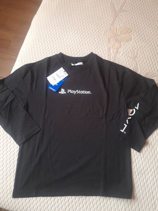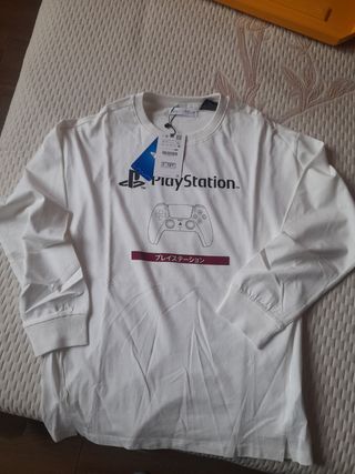 Camiseta de manga larga con diseño de PlayStation. - Estampado frontal con el logo de PlayStation y un mando. - Detalle de texto en japonés. - Cuello redondo y mangas largas.