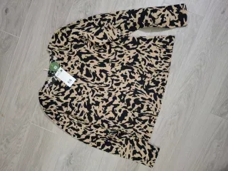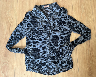 Blusa semitransparente de manga larga con estampado animal print de leopardo en tonos grises, negros con toques dorados. Detalle fruncido con volantes en el pecho. Tela ligera con cierre con botones delanteros transparentes. ✨ Color: tonos grises, negros con toques dorados ✨ Marca: Joyxtin ✨ Talla: XXL (talla menos) ✨ Medidas: 60cm de axilas / 50cm de hombros / 60cm de largo / 70cm largo de la manga. ✨ Composicion: 100% viscosa