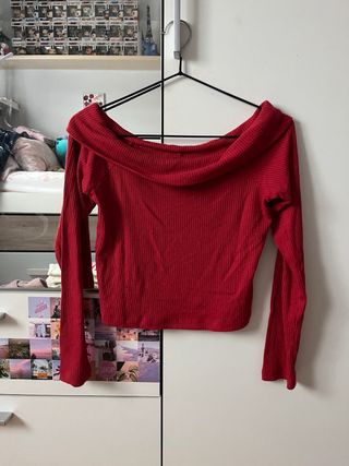 Este top rojo es una prenda llamativa y moderna. - Diseño con manga larga. - Detalle fruncido en la parte delantera. - Escote Bardot.