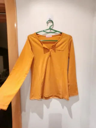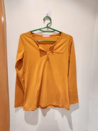 Camiseta de manga larga en color mostaza. Presenta un diseño con botones en la zona del escote y un bolsillo. - Cuello con botones. - Bolsillo en el pecho. -Talla S/M