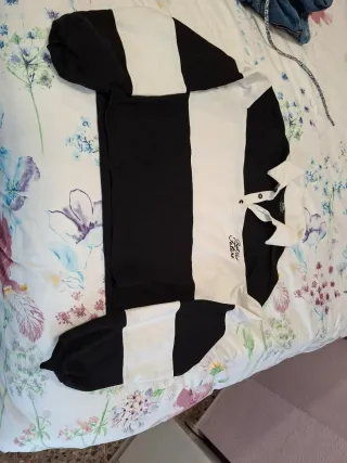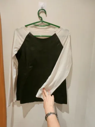 Camiseta con diseño moderno y original. - Cuerpo de polipiel negra. - Mangas blancas de tela. -Talla S/M