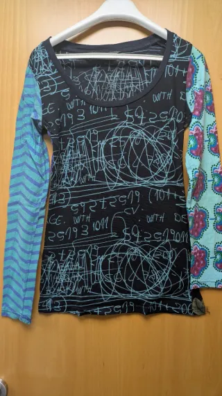Camiseta de manga larga con un diseño llamativo y original. - Mangas de diferentes estampados. - Estampado frontal con texto y garabatos. Tengo más modelos si quieres te hago un lote