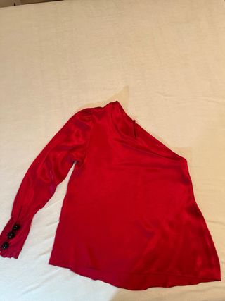 Blusa elegante de color fucsia con un diseño asimétrico. - Tejido satinado. - Manga larga con puño abotonado. - no conserva etiquetas - largo 62 cm 43 cm ancho axila