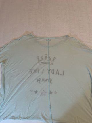 Camiseta de manga larga con un diseño gráfico de corona y estrellas. El texto Lady Like grunge le da un toque único. - Diseño frontal con corona y estrellas. - Estampado Lady Like grunge. Verde azulado muy clarito Medidas: 61 cm largo 70 cm amcho