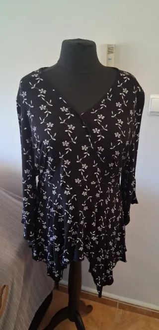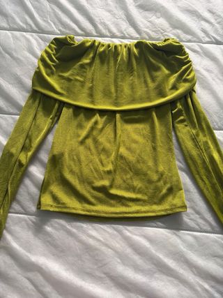 Camiseta ajustada de manga larga para mujer. - Diseño con escote en V cruzado. - Tejido suave y elástico. - Corte muy favorecedor que realza la figura. - Manga acampanada. Talla justita, sin usar, la duplique en un pedido y tengo otra igual. El color real es el más oscuro, el de la foto principal