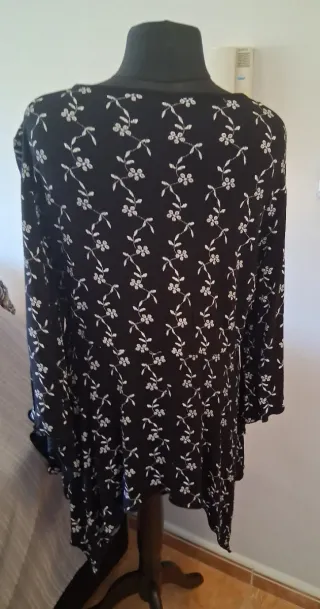 Vendo camiseta de manga larga con cuello en pico de color negro. Tiene un detalle en el escote de tela lencera. Talla L de mujer de la marca de ropa H&M. En perfecto estado. Las medidas son: - De sisa a sisa: 47cm - Largo de la prenda: 70,5cm