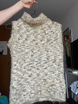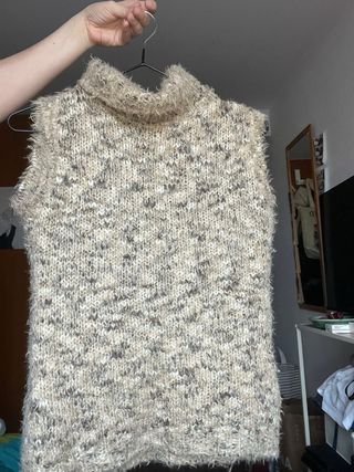 Camiseta de canalé en color gris plata con ligeros hilos de brillo brilli plateados, de manga larga (58 cm), cuello redondo, ajustada y calentita. Podéis ver las medidas en las fotos: ancho 40 cm y largo 50 cm. Es una talla S de Mango. Le he cortado las etiquetas por comodidad aunque solo la he usado una vez, está como nueva. Es una prenda cómoda y versátil.