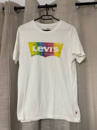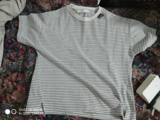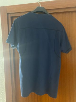 Camiseta de manga corta con cuello en V y tejido elástico. Talla L pero es pequeña. Puesta una vez. - Diseño acanalado. - Corte ajustado.