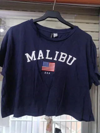 Camiseta de manga corta con estampado de Malibú y la bandera de EE. UU. De H&M - Diseño cropped. - Cuello redondo.