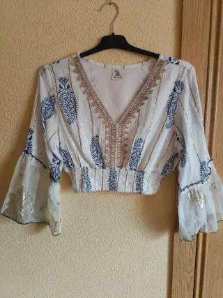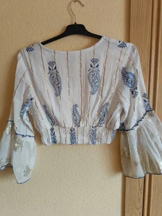Camiseta crop con un diseño vibrante y detalles únicos. - Estampado paisley en azul y blanco. - Mangas acampanadas con detalles dorados. - Cintura elástica. - Escote en V con adornos. - Tejido ligero. - Talla S - Nueva
