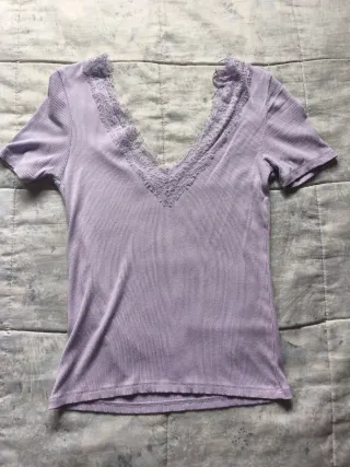Camiseta de manga corta con un delicado detalle de encaje en el escote. - Tejido acanalado. - Escote en V con encaje. - Mangas cortas.