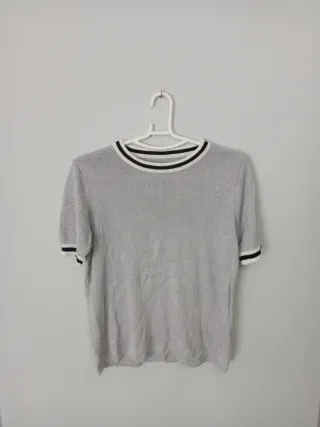 Camiseta de mujer de manga corta con un tejido brillante. - Cuello redondo con ribetes blancos y negros. - Mangas cortas con detalle de ribetes. - Tejido ligero y con brillo.