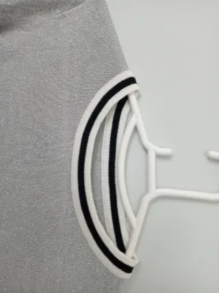 Camiseta de manga larga con un diseño de rayas plateadas sobre fondo blanco. - Diseño de rayas horizontales. - Cuello redondo. - Mangas raglán.