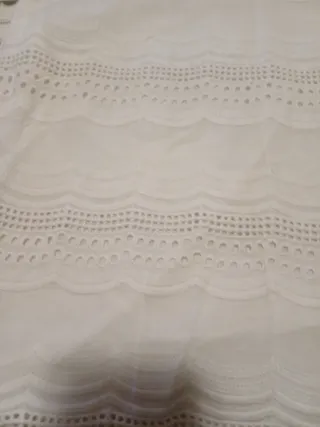 Blusa blanca con un delicado diseño calado y manga corta. Talla S grande Cómo nueva - Escote Bardot. - Tejido ligero y transpirable.