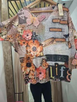 Camiseta con un diseño artístico y vibrante, perfecta para añadir un toque único a tu estilo. - Estampado detallado de mariposas y flores. - Motivos de postales y textos vintage. - Diseño de cuello en V. - Mangas amplias y cómodas.