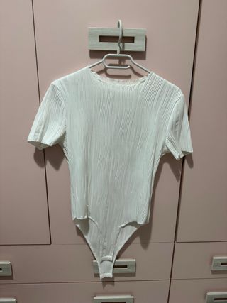 Body blanco con un diseño de tejido plisado. - Manga corta. - Cuello redondo. - Tejido elástico. - Cierre de corchetes en la parte inferior.