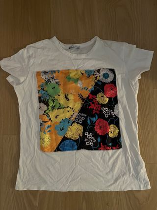 Camiseta blanca de Zara con un llamativo estampado floral. - Diseño patchwork con diferentes bloques de color. - Estampado de flores vibrantes sobre fondo naranja y negro. - Cuello redondo y manga corta.