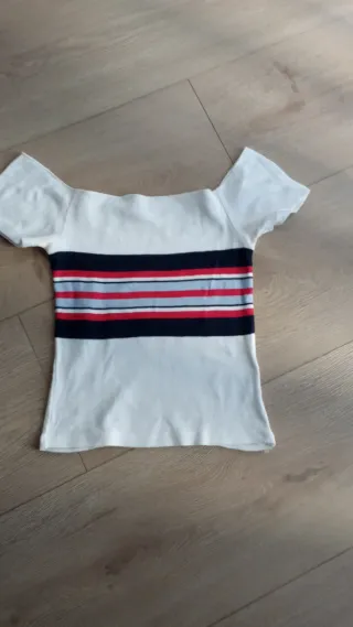 Camiseta de manga larga con un diseño coqueto y detalles que marcan la diferencia. - Escote con ribete oscuro y un pequeño lazo. - Mangas acampanadas con acabado festoneado. - Tejido acanalado que se ajusta al cuerpo. En buen estado. Toda la ropa que se envía se lava antes.