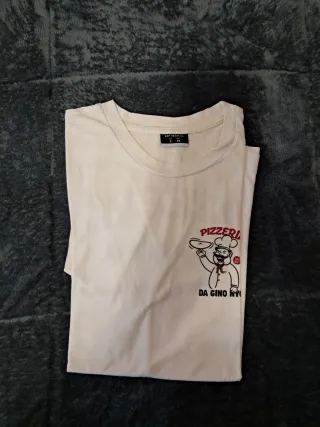 Camiseta blanca con un divertido estampado en el pecho. - Diseño de Pizzería Da Gino NYC. - Estampado con un chef y una pizza.