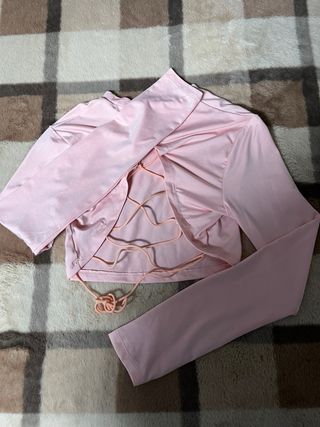 Top de manga larga en color rosa clarito. Su diseño es moderno y versátil con la espalda al descubierto. - Manga larga. - Corte crop top.