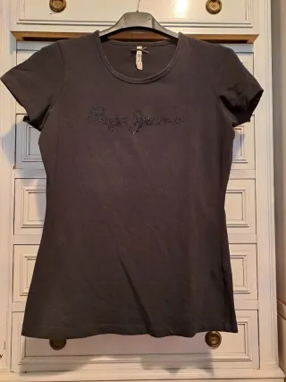 Camiseta de manga corta y cuello redondo. Logo de Pepe Jeans con brillantes. Le faltan 3 brillantes.