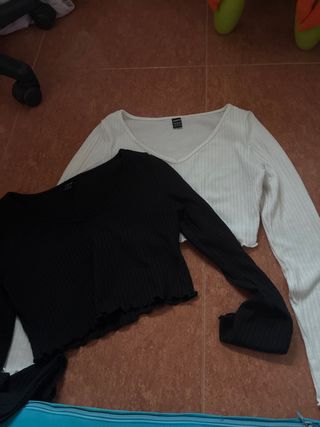 Conjunto de dos tops de manga larga con cuello en V y acabado festoneado. Cada uno a 1,50 si quereis una sola - Diseño acanalado. - Corte cropped.