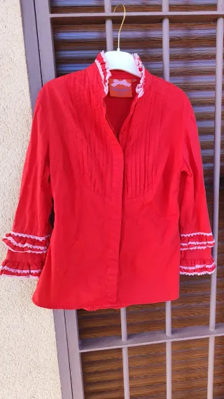 Camisa de la marca Almatrichi en color rojo. Presenta un diseño con detalles de volantes. - Cuello alto con volantes. - Mangas largas con puños de volantes. - Adorno de plisados en la parte delantera. -Tiene algunas manchas, pero se notan muy poco
