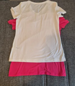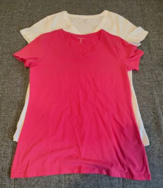 Pack de dos camisetas básicas de manga corta con cuello en V. - Una camiseta es de color rosa vibrante. - La otra camiseta es de color blanco. - Tejido suave y cómodo.