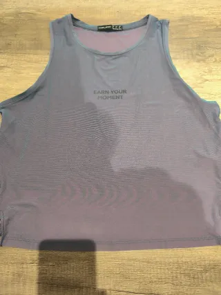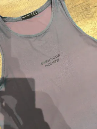 Camiseta deportiva de Oysho, precioso tejido y color, con un acabado iridiscente que cambia de tono entre gris, morado, rosa y azul. Ultraligera y transpirable, ideal para entrenamientos. Usada una o dos veces, está impecable. Talla M - Diseño sin mangas. - Detalle de texto EARN YOUR MOMENT en el pecho.