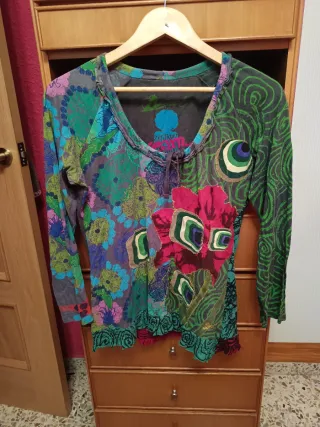Camiseta con un diseño frontal llamativo de tela satinada y mangas lisas. Casi sin uso Creo que es una talla L (pongo fotos porque quité la etiqueta) - Diseño frontal con estampado paisley. - Mangas y parte trasera de color marrón liso. - Cuello redondo con detalle. - Tejido suave y cómodo.