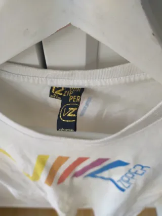 Camiseta en perfecto estado de manga corta con un diseño gráfico colorido en la parte delantera. - Diseño de rayas verticales en arcoíris. - Detalle de texto ZIPPER en azul.