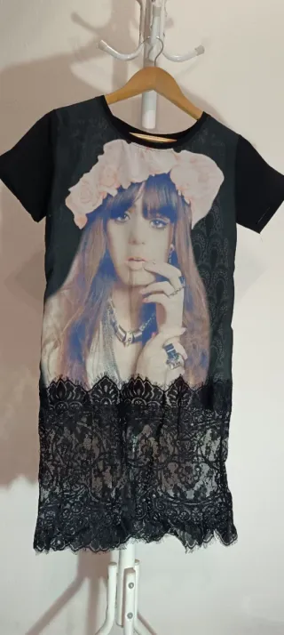 Camiseta con un diseño frontal de una mujer y detalle de encaje en la parte inferior. - Manga corta. - Estampado frontal. - Aplicación de encaje negro en el bajo.
