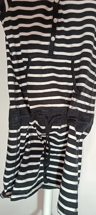 Vestido de rayas negras y blancas con capucha. Tiene un cordón ajustable en la cintura y bolsillos. - Diseño de rayas. - Capucha. - Cordón ajustable. - Bolsillos delanteros.