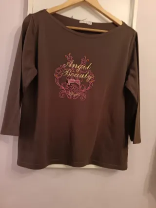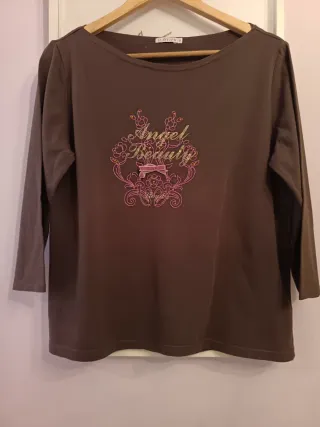 Camiseta marrón con un diseño original y costuras visibles. - Talla 40-42. - Manga larga. - Cuello redondo.
