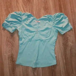 Blusa de manga corta abullonada con un diseño moderno y favorecedor. - Cremallera frontal plateada con tirador. - Cuello en V. - Detalle de costuras que estilizan la figura.