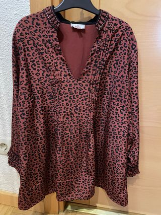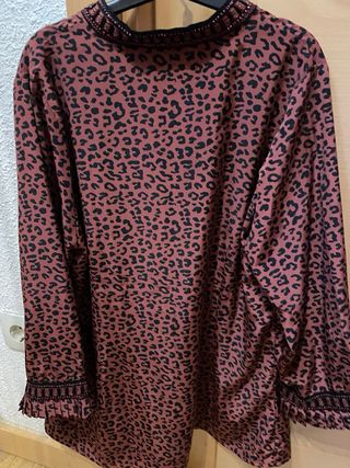 Camisa de la marca Niza con un llamativo estampado de leopardo. - Diseño con cuello en V y detalles de pedrería. - Mangas largas con puños adornados. - Pliegues decorativos en la parte delantera.