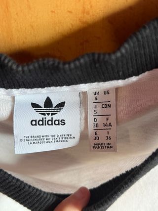 ¡Vuelve a los clásicos con esta joya de Adidas Originals! 🤍🖤 Si buscas ese toque aesthetic y retro, esta es tu camiseta. Es el modelo con el cuello y los puños en contraste negro, un diseño icónico que queda increíble con cualquier outfit (vaqueros, faldas o incluso debajo de una americana). Diseño: Logotipo bordado (Trefoil) y las clásicas tres bandas negras. Estado: En muy buen estado, muy cuidada. El blanco está brillante y el tejido es súper suave. Corte: Cuello redondo amplio, muy favorecedor y cómodo. Estilo: Perfecta para un look "clean girl" o retro-sport.