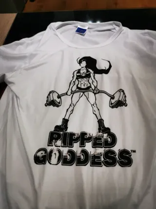 Camiseta blanca con estampado Ripped Goddess. - Diseño con figura femenina levantando pesas. - Estampado negro con texto. - Manga corta. Color blanco talla como una talla S entallada