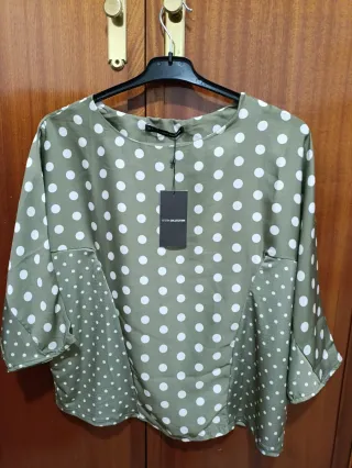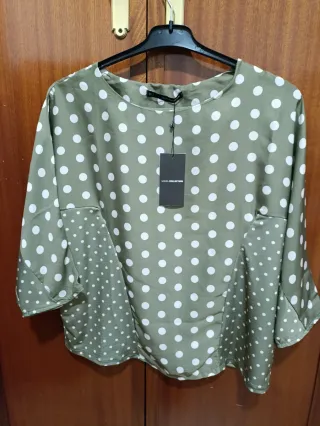 Camisa de señora con un diseño de lunares. - Estampado de lunares blancos sobre fondo verde. - Diseño con paneles laterales. - Manga corta.
