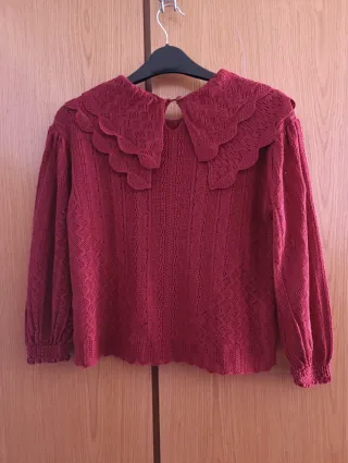 Camisa granate punto calado Zara t.S manga francesa con elástico en el puño y volantes en el cuello por delante y detrás.