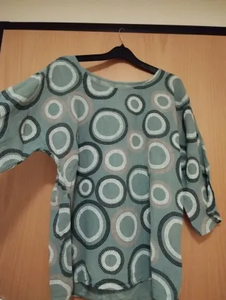 Camisa de mujer con estampado de círculos en varios tonos. - Diseño veraniego. - Estampado multicolor. - Talla única, para talla L Diseño holgado, muy fresquita, manga 3/4