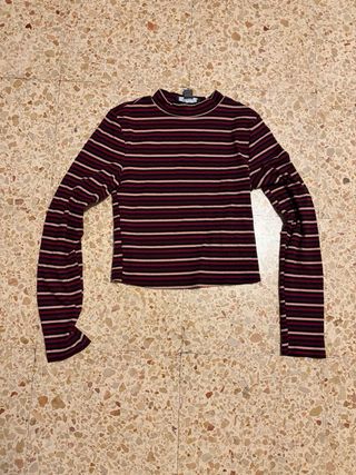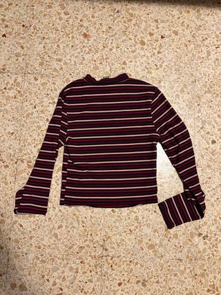 Top de manga larga con un diseño de rayas verticales. - Cuello alto. - Diseño de rayas en tonos rojos y blancos.