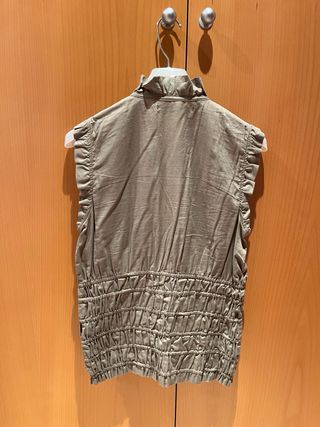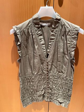 Camisa sin mangas de Zara con un diseño fruncido y botones. - Cuello alto con volantes. - Mangas cortas con volantes. - Cintura elástica fruncida. - Cierre de botones en la parte delantera.