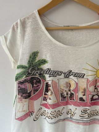 Camiseta manga corta de la marca francesa Maje. Talla 1. Tejido de algodón lino en color crudo con estampado en delantero.